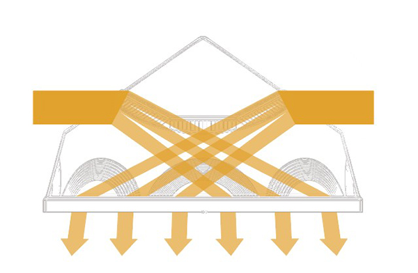 不僅使上午及下午陽光轉(zhuǎn)向?qū)?,還對光線進行聚焦,提高采光效率